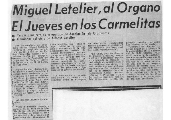 Miguel Letelier al Organo el jueves en los Carmelitas. [artículo]
