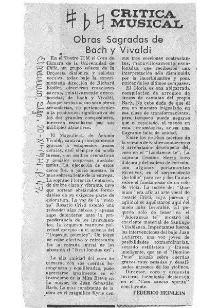 Sierra, Cristina - Cristi, Rosario - Kistler, Richter - Villablanca, Santiago - Crítica musical - Conciertos - Música docta - Coros con orquesta - Gutiérrez, Juan