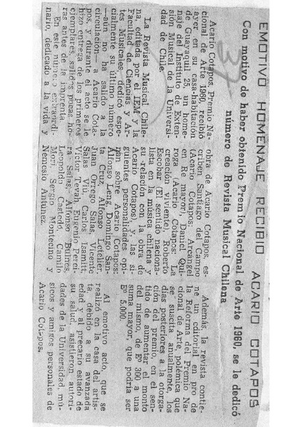 Emotivo Homenaje recibió Acario Cotapos Con motivo de haber obtenido Premio Nacional de Arte 1960, se le dedicó número de Revista Musical Chilena [artículo]
