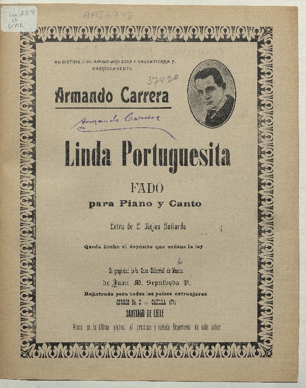 Linda portuguesita [música] : fado para piano [y canto] letra de Luis Rojas Gallardo ; música de Armando Carrera.