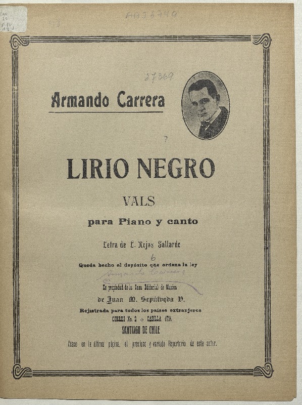 Lirio negro [música] : vals para piano [y canto] letra de Luis Rojas Gallardo ; música de Armando Carrera.