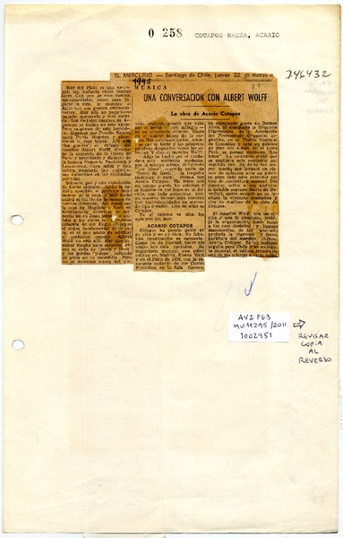 Una conversación con Albert Wolff La obra de Acario Cotapos [artículo]