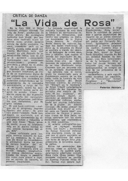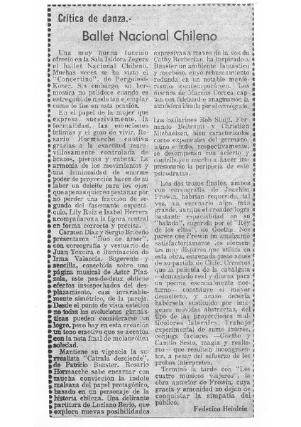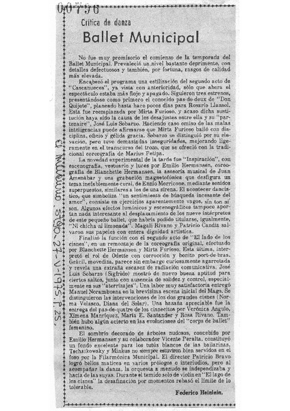 Ballet - Rivano, Magaly - Amenábar Ruiz, Juan Eduardo - Crítica de danza - Loyola, Victor - Bravo, Patricio - Furioso, Mirta - Sobarzo, José Luis - Hermansen, Emilio - Hermansen, Blanchette - Candia, Patricia