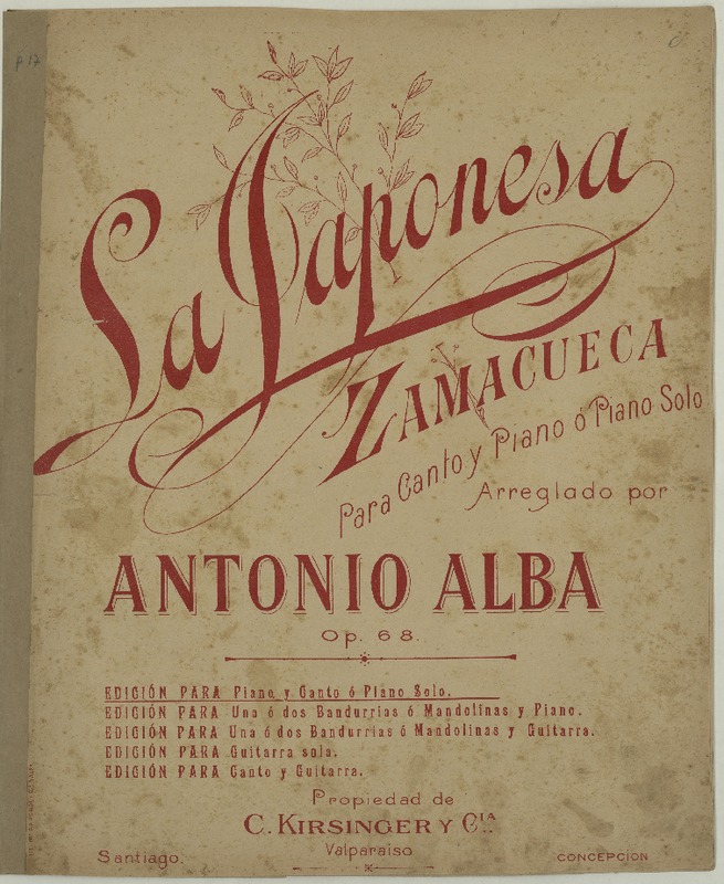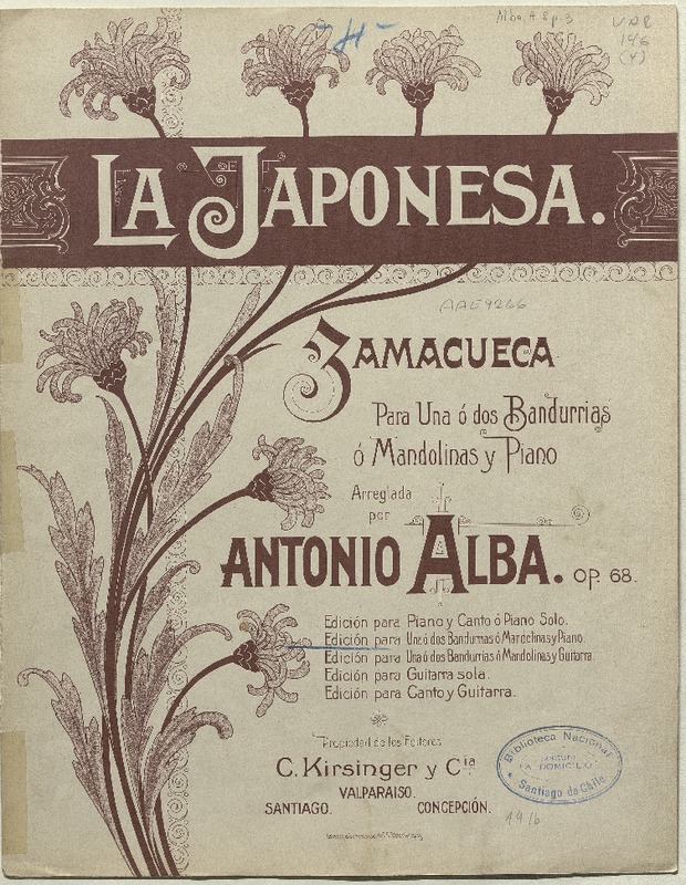 La Japonesa zamacueca [para] una o dos bandurrias o mandolinas y piano [música] : arreglada por Antonio Alba.