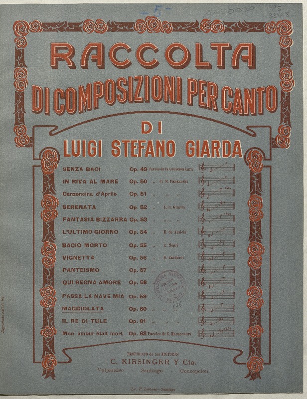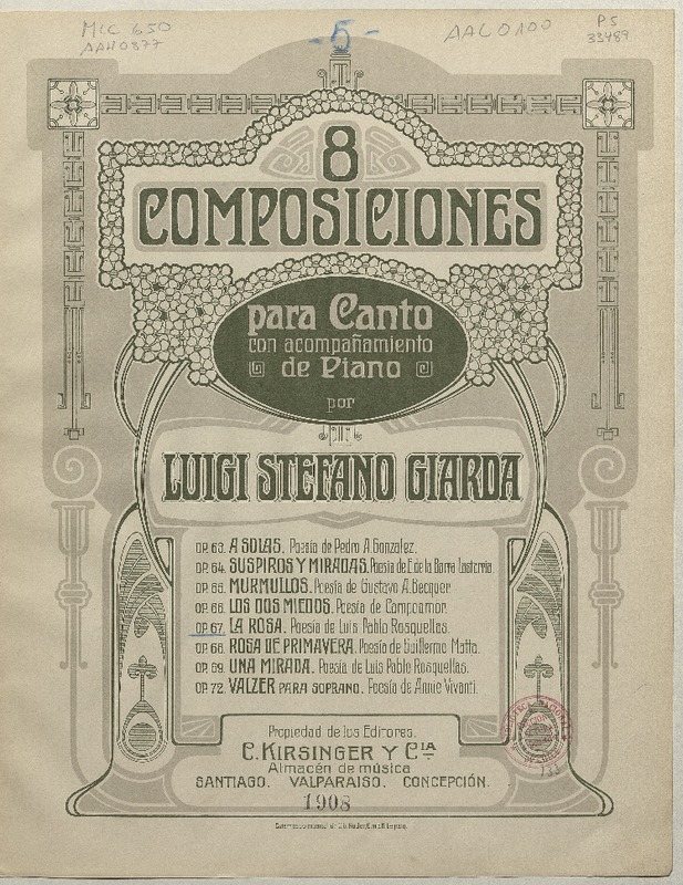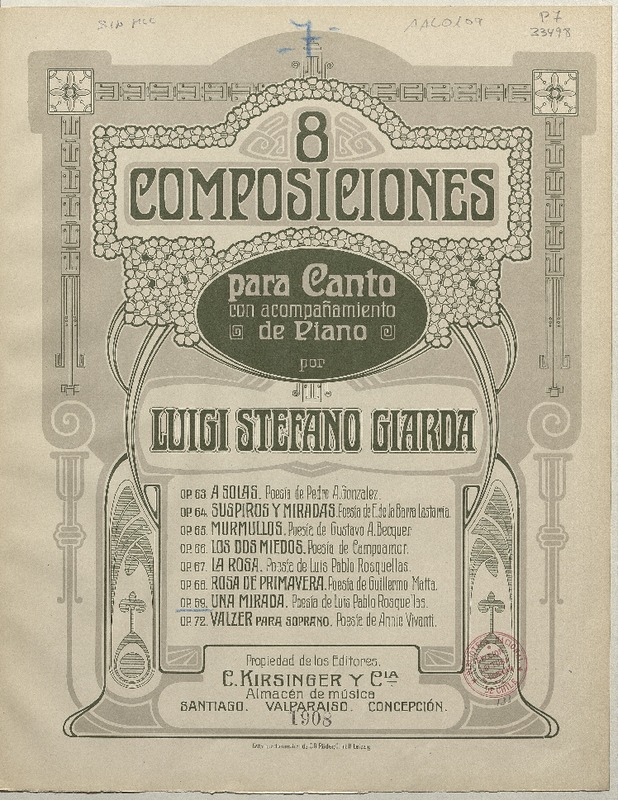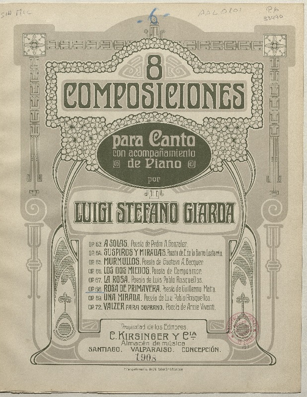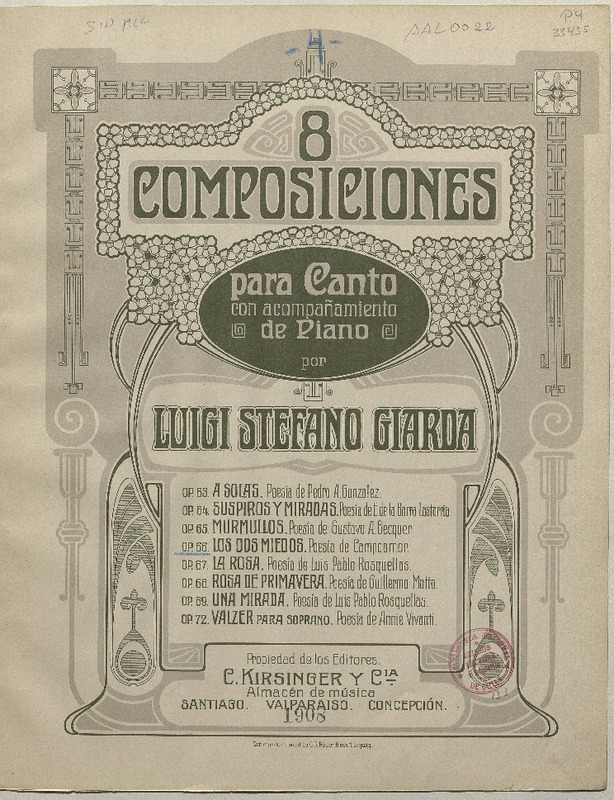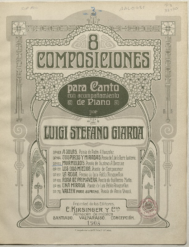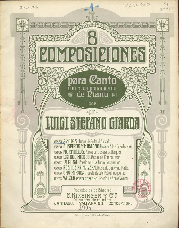 Suspiros y miradas [para canto con acompañamiento de piano] [música] : poesía de E. de la Barra Lastarria ; Luigi Stefano Giarda.