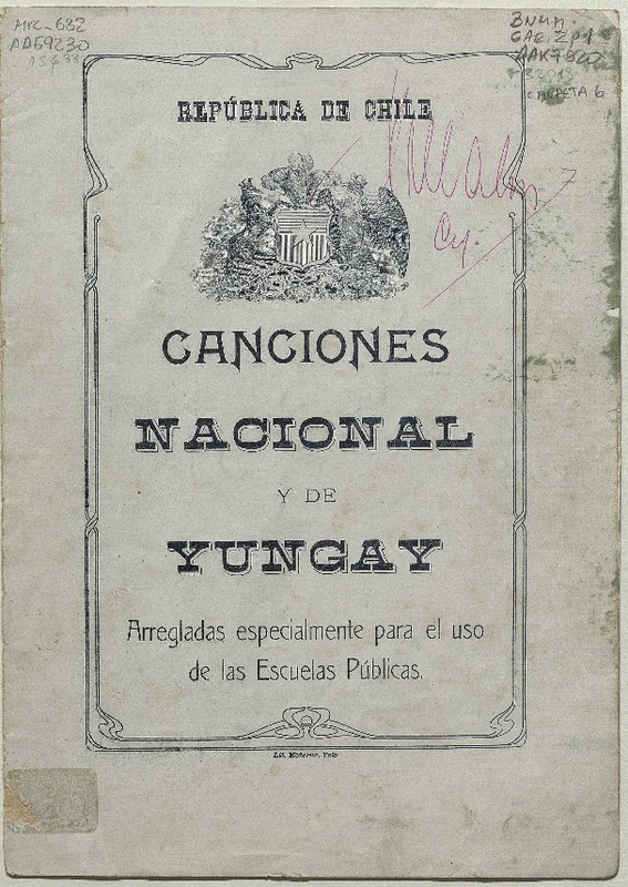 Canciones nacional y de Yungay arregladas para el uso de las escuelas públicas [de la] República de Chile [para canto y piano] [música] : Ramón Carnicer ; José Zapiola.