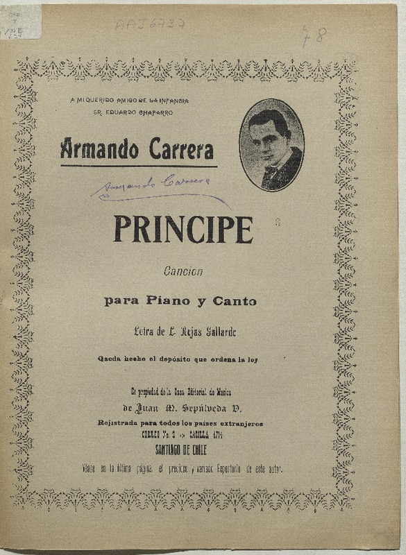 Príncipe canción para piano y canto [música] : letra de Luis Rojas Gallardo ; música de Armando Carrera.