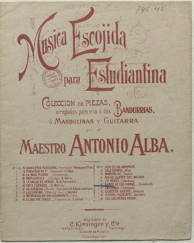 Danza de las horas fantasía ; arreglada para una o dos bandurrias o mandolinas y guitarra [música] : A. Ponchielli ; arreglada para estudiantina por Antonio Alba.