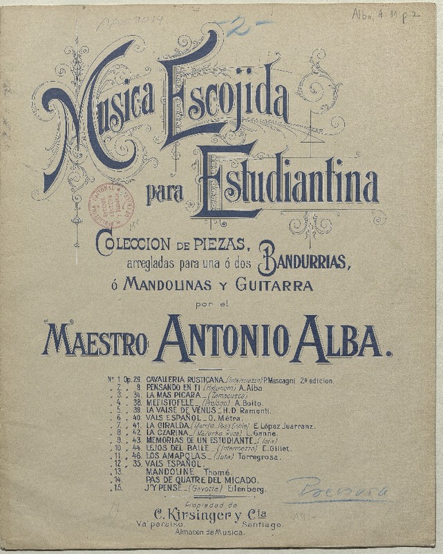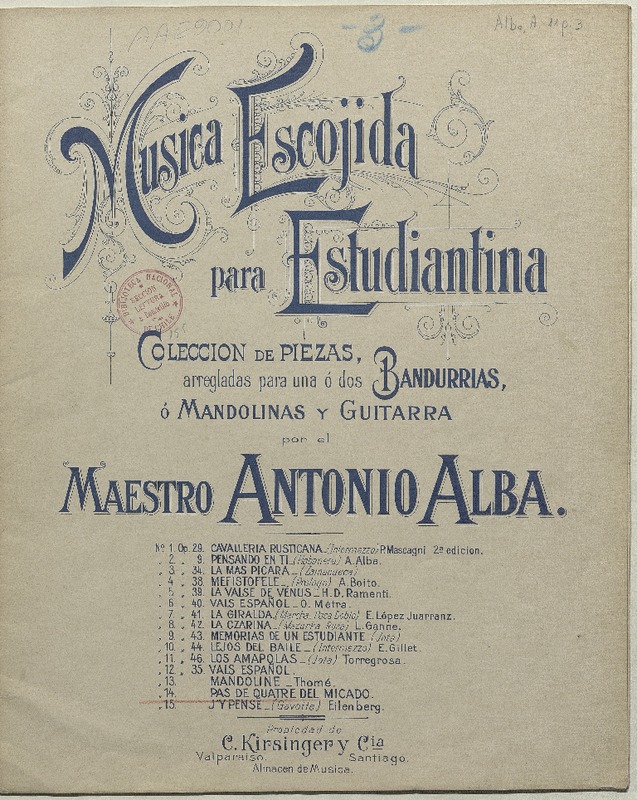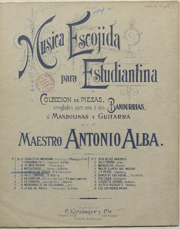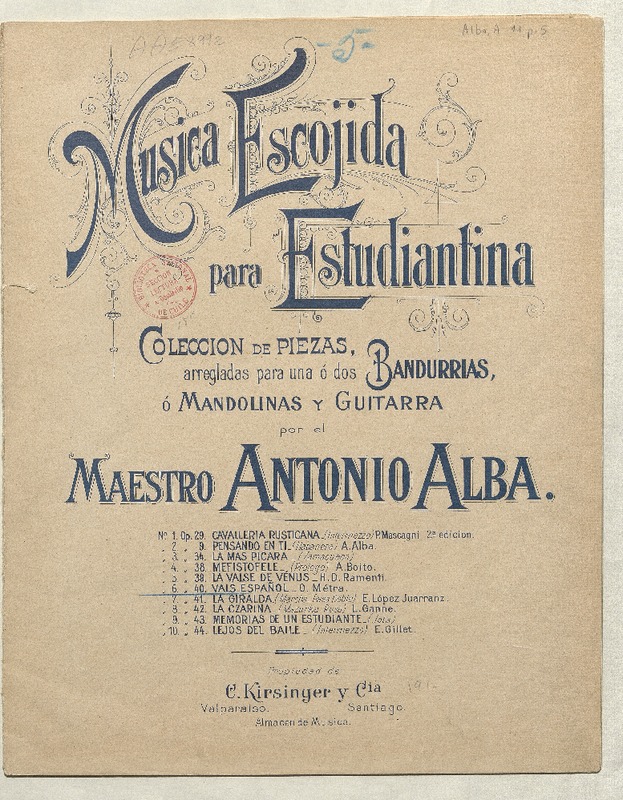 Serénade valse espagnol ; arreglada para una o dos bandurrias o mandolinas y guitarra [música] : por O. Métra ; arreglada para estudintina por Antonio Alba.
