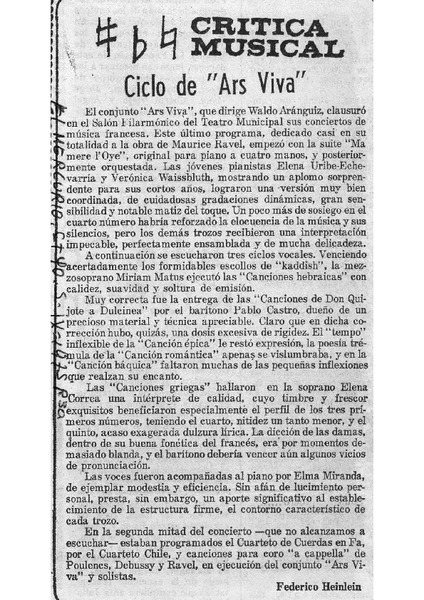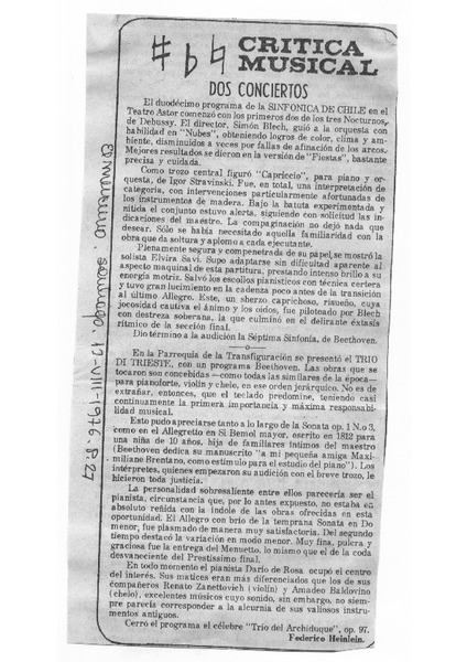 Música docta - Conciertos - Crítica musical - Donatucci, Emilio - Villablanca, Santiago - Junge, Arturo - Aránguiz, Waldo - Benzecry, Mario - Matus, Myriam - Lena, Marissa - Lara Bravo, Fernando