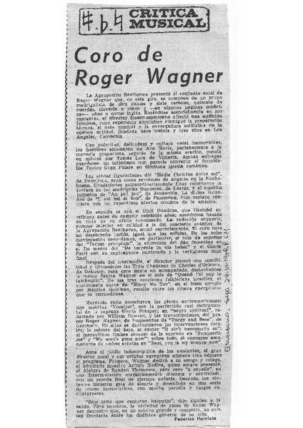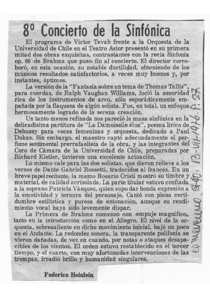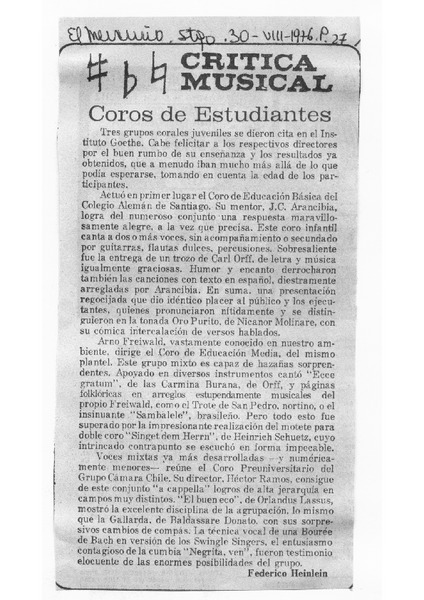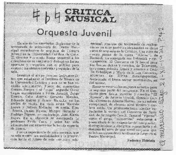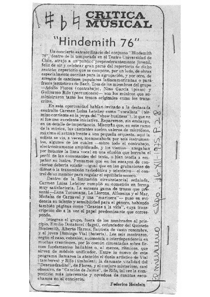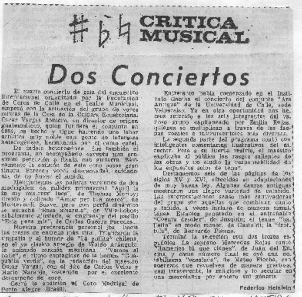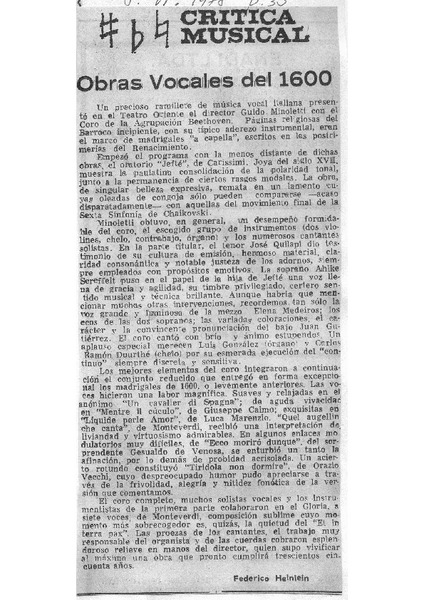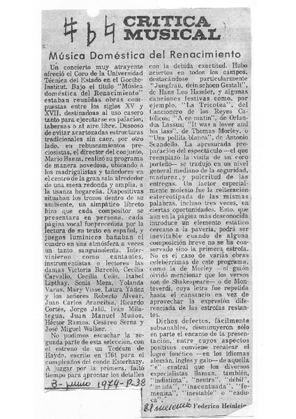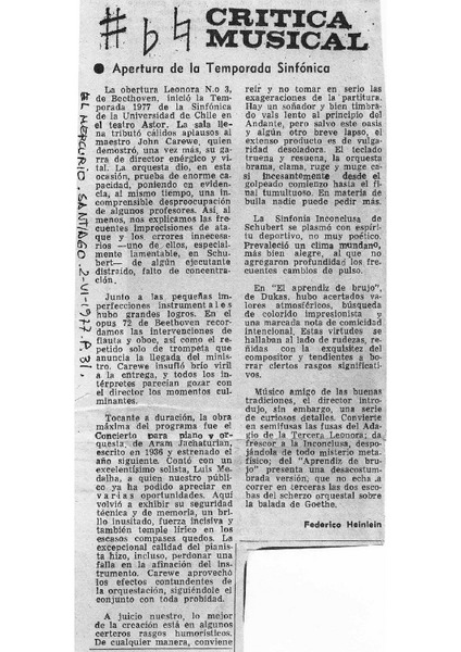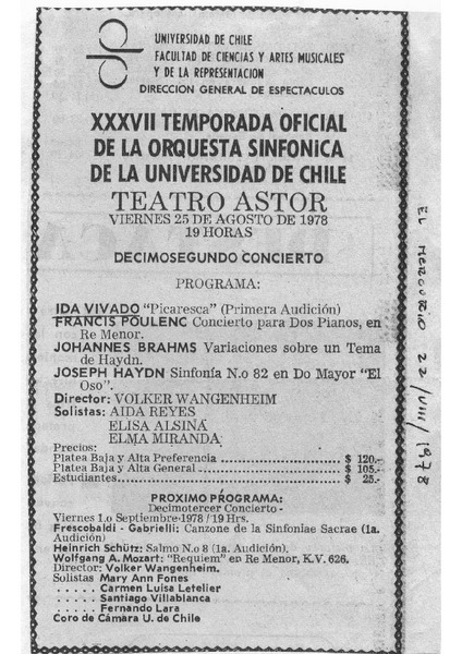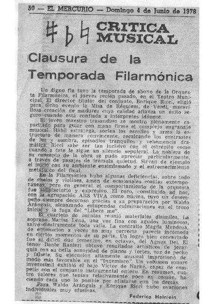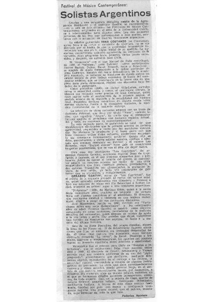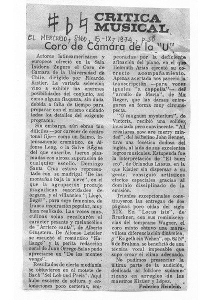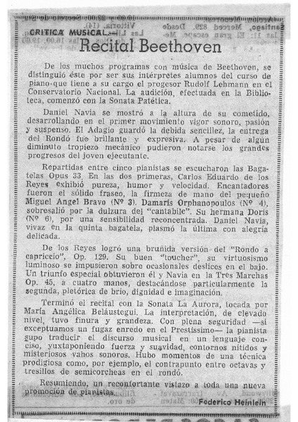Hernández, Augusto - Música docta - Conciertos - Crítica musical - Letelier, Miguel - Wangenheim, Volker - Fones, Mary Ann - Letelier, Carmen Luisa - Gacitúa, Oscar - Peña, Enrique - Kroumovitch, Routa - Goméz, Alvaro - Bravo, Ximena - Ponce, Gilberto - Mallea, Cancio - Baldin, Aldo - Venegas, Ramón - Lara Bravo, Fernando