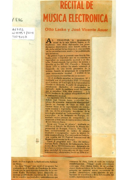 Recital de música electrónica Otto Laske y José Vicente Asuar [artículo]