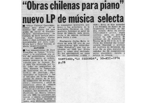 Reseña de discos - Laks, Julio - Lémann Cazabón, Juan - Gacitúa, Oscar - Industria musical - Botto, Carlos - Amenábar Ruiz, Juan Eduardo - Savi, Elvira - Música para piano