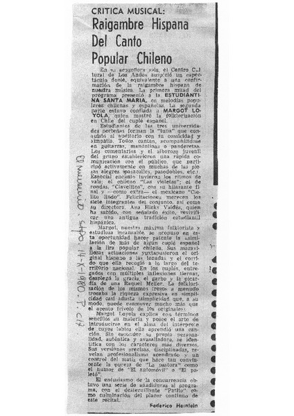 Loyola, Margot - Hicks Valdés, Ana - Estudiantina Santa María - Folkloristas - Folklore - Crítica musical - Música folklórica