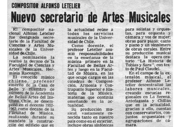 Nuevo secretario de Artes Musicales Compositor Alfonso Letelier Llona [artículo]