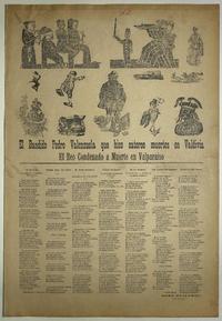 El bandido Pedro Valenzuela que hizo catorce muertes en Valdivia ; El reo condenado a muerte en Valparaiso / Rosa Guajardo. [Chile] : [Impresor no identificado], [1880?] 1 hoja : ilustraciones ; 55 x 39 cm. .