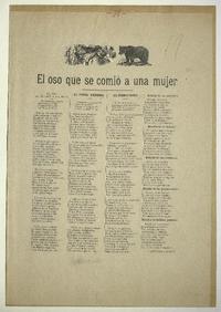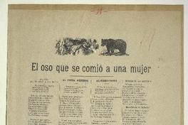 El oso que se comió a una mujer / J. Hipolito Cordero. [Chile] : [Impresor no identificado], [1890?] 1 hoja : ilustraciones ; 40 x 28 cm. .