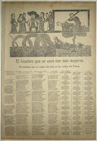 El hombre que se casó con seis mujeres ; El culebron que se comió a la niña en las minas del Volcan / José Hipólito Casas Cordero. [Chile] : Imprenta L. V. Caldera, [1890?] 1 hoja : ilustraciones ; 55 x 39 cm. .