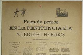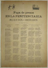 Fuga de presos en la Penitenciaria : muertos i heridos / Juan B. Peralta. [Chile] : [Impresor no identificado], [1894?] 1 hoja : ilustraciones ; 53 x 37 cm. .
