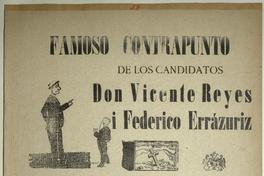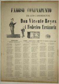 Famoso contrapunto de los candidatos don Vicente Reyes i Federico Errázuriz / Juan B. Peralta. [Chile] : Imprenta Albion, [1896?] 1 hoja : ilustraciones ; 54 x 39 cm. .