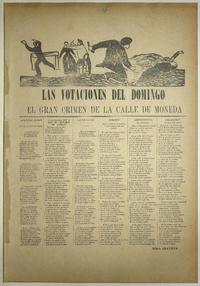 Las votaciones del domingo ; El gran crímen de la calle de Moneda / Rosa Aravena. [Chile] : [Impresor no identificado], [1897?] 1 hoja : ilustraciones ; 55 x 39 cm. .