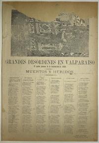 Grandes desórdenes en Valparaiso : el pueblo protesta de la Sociedad del Sr. Jara : muertos i heridos / Rosa Araneda. [Chile] : [Impresor no identificado], [1894?] 1 hoja : ilustraciones ; 56 x 39 cm. .