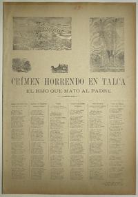 Crímen horrendo en Talca : el hijo que mató al padre / Rosa Araneda. [Chile] : [Impresor no identificado], [1894?] 1 hoja : ilustraciones ; 56 x 39 cm. .