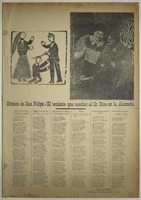 Crímen en San Felipe : el teniente que asesinó al Sr. Rios en la Alameda / Rosa Araneda. [Chile] : [Impresor no identificado], [1895?] 1 hoja : ilustraciones ; 56 x 40 cm. .