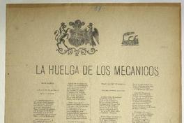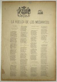 La huelga de los mecanicos / A. Reyes. [Chile] : [Impresor no identificado], [1892?] 1 hoja : ilustraciones ; 55 x 39 cm. .