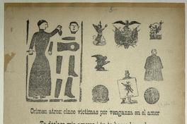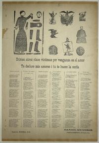 Crímen atroz: cinco víctimas por venganza en el amor ; Te declaro mis amores i tu te haces la sorda / Daniel Meneses. [Chile] : Imprenta Moneda, [entre 1890-1909] 1 hoja : ilustraciones ; 54 x 39 cm. .