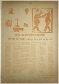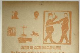 Captura del asesino Marcelino Garrido : que hizo morir mártir a la mujer en la calle de Morandé / Daniel Meneses. [Chile] : Imprenta Moneda, [1896?] 1 hoja : ilustraciones ; 56 x 38 cm. .