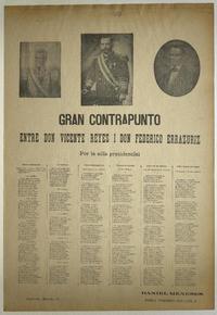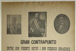 Gran contrapunto entre don Vicente Reyes i don Federico Errazuriz : por la silla presidencial / Daniel Meneses. [Chile] : Imprenta Moneda, [1896?] 1 hoja : retratos ; 56 x 39 cm. .