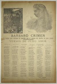Bárbaro crímen : la mujer que victimó al marido con el mocho del hacha de puro gusto ; Versos de puro amor / Daniel Meneses. [Chile] : Imprenta CERV., [1895?] 1 hoja : ilustraciones ; 54 x 38 cm. .