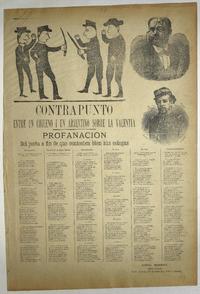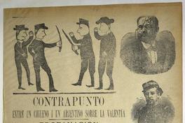 Contrapunto entre un chileno i un arjentino sobre la valentía ; Profanacion del poeta a fin de que contesten bien sus colegas / Daniel Meneses. [Chile] : [Impresor no identificado], [1895?] 1 hoja : ilustraciones, retratos ; 56 x 39 cm. .