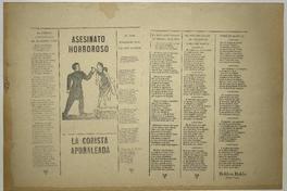 Asesinato horroroso : la corista apuñaleada / Boldo á Boldo. [Chile] : [Impresor no identificado], [1894?] 1 hoja : ilustraciones ; 37 x 56 cm. .