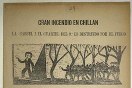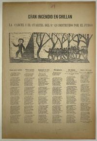 Gran incendio en Chillan : la cárcel i el cuartel del 9º es destruido por el fuego / José Dionisio Castro H. [Chile] : [Impresor no identificado], [1899?] 1 hoja : ilustraciones ; 55 x 39 cm. .