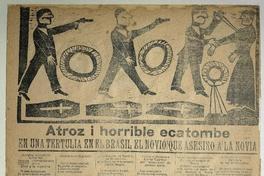 Atroz i horrible ecatombe en una tertulia en el Brasil : el novió que asesino a la novia / Daniel Meneses. Valparaíso : Imp. y Lit. de G. A. Rohde y Ca., [1902?] 1 hoja : ilustraciones ; 54 x 39 cm. .