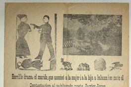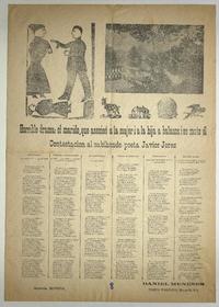 Horrible drama: el marido que asesinó a la mujer i a la hija a balazos i se mato él ; Contestación al sabihondo poeta Javier Jerez / Daniel Meneses. [Chile] : Imprenta Moneda, [1897?] 1 hoja : ilustraciones ; 54 x 38 cm. .