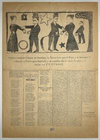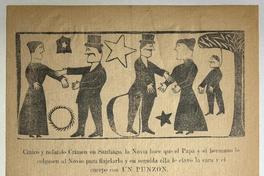 Cínico y nefando crímen en Santiago, la novia hace que el papá y el hermano le colgasen al novio para flajelarlo y en seguida ella le clavó la cara y el cuerpo con un punzon / Daniel Meneses. [Santiago] : Imprenta Sud-Americana Tacna y Bolivar, [1901?] 1 hoja : ilustraciones ; 51 x 35 cm. .