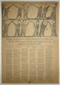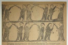 Drama sangriento en Antofagasta : la mujer que dió de balazos al querido por venganza y en seguida se suicidó ella / Daniel Meneses. [Chile] : Imprenta Moneda, [1900?] 1 hoja : ilustraciones ; 55 x 39 cm. .