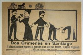 Dos crímenes en Santiago : el roto que asesinó al zapatero i al guardian en la calle San Alfonso i la mujer desgollada en la calle San Pablo / Daniel Meneses. Valparaíso : Imprenta y Litografía de G. A. Rohde y Ca., [1902?] 1 hoja : ilustraciones ; 55 x 39 cm. .