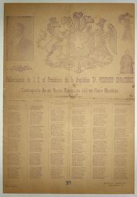 Fallecimiento de S. E. el Presidente de la República Sr. Federico Errazuriz ; Contrapunto de un huaso riesquista con un futre monttino / Manuel Meneses. [Chile] : Imprenta Moneda, [1901?] 1 hoja : ilustraciones ; 56 x 39 cm. .