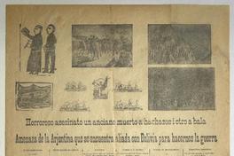 Amenaza de la Arjentina que se encuentra aliada con Bolivia para hacernos la guerra ; Horroroso asesinato un anciano muerto a hachazos i otro a bala / Daniel Meneses. [Chile] : Imprenta Moneda, [1894?] 1 hoja : ilustraciones ; 55 x 39 cm. .