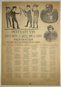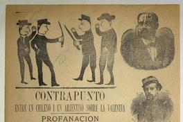 Contrapunto entre un chileno i un arjentino sobre la valentía ; Profanacion del poeta a fin de que contesten bien sus colegas / Daniel Meneses. [Chile] : [Impresor no identificado], [1895?] 1 hoja : ilustraciones, retratos ; 56 x 39 cm. .