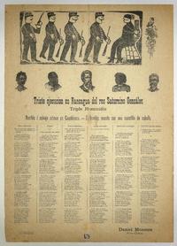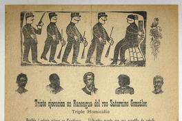Triste ejecución en Rancagua del reo Saturnino González : triple homicidio ; Horrible i salvaje crímen en Casablanca : el hombre muerto con una carretilla de caballo / Daniel Meneses. [Chile] : Imprenta Moneda, [entre 1890-1909] 1 hoja : ilustraciones ; 54 x 39 cm. .