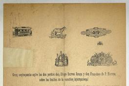 Gran contrapunto entre los dos peritos don Diego Barros Arana y don Francisco de P. Moreno, sobre los límites de la cuestión internacional / Daniel Meneses. [Chile] : [Impresor no identificado], [1898?] 1 hoja : ilustraciones ; 54 x 38 cm. .
