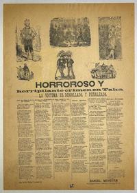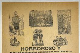 Horroroso y horripilante crimen en Talca : la víctima es degollada y puñaleada / Daniel Meneses. [Chile] : Imprenta de "La Policia", [entre 1890-1909] 1 hoja : ilustraciones ; 54 x 39 cm. .