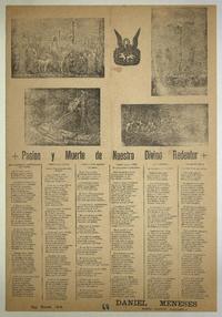 Pasion y muerte de Nuestro Divino Redentor / Daniel Meneses. [Chile] : Imprenta Moneda, [1896?] 1 hoja : ilustraciones ; 53 x 37 cm. .