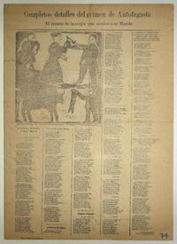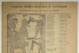 Completos detalles del crimen de Antofagasta ; El crímen de la mujer que asesinó a su marido / Daniel Meneses. Antofagasta : Imprenta "El Comercio", [entre 1890-1909] 1 hoja : ilustraciones ; 53 x 38 cm. .