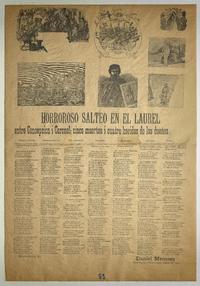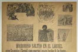 Horroroso salteo en el Laurel : entre Concepción i Coronel; cinco muertos i cuatro heridos de los dueños ... / Daniel Meneses. [Chile] : Imprenta Moneda, [1900?] 1 hoja : ilustraciones ; 54 x 38 cm. .